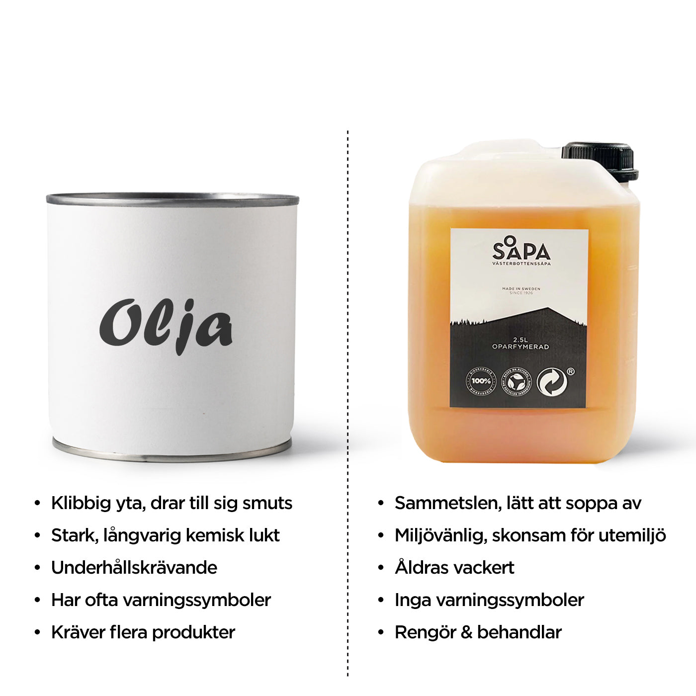 Vår trallsåpa är en lokalt tillverkad produkt med fokus på hållbarhet. Då såpan är överfettad fungerar den både som effektiv rengöring och behandling i ett – den löser effektivt smuts och återfuktar träet samtidigt som den skyddar mot fukt, kyla och solens påverkan. Genom att återfetta och skydda trämaterialet är den ett tryggt val som förlänger trallens livslängd.