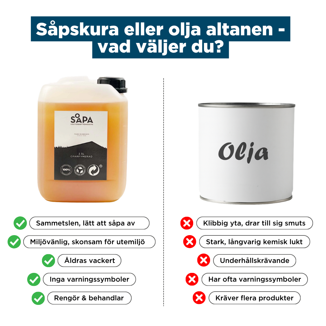 Västerbottenssåpas trallsåpa kan användas på de flesta oljade träytor, så länge de inte är behandlade med linoljefärg. Om ditt altangolv är behandlat med en annan typ av olja, till exempel en vanlig trälut eller olja för utomhusbruk, kan trallsåpan användas för att både rengöra och återfetta träet. Delar av den produkt du använt tidigare kommer att försvinna.