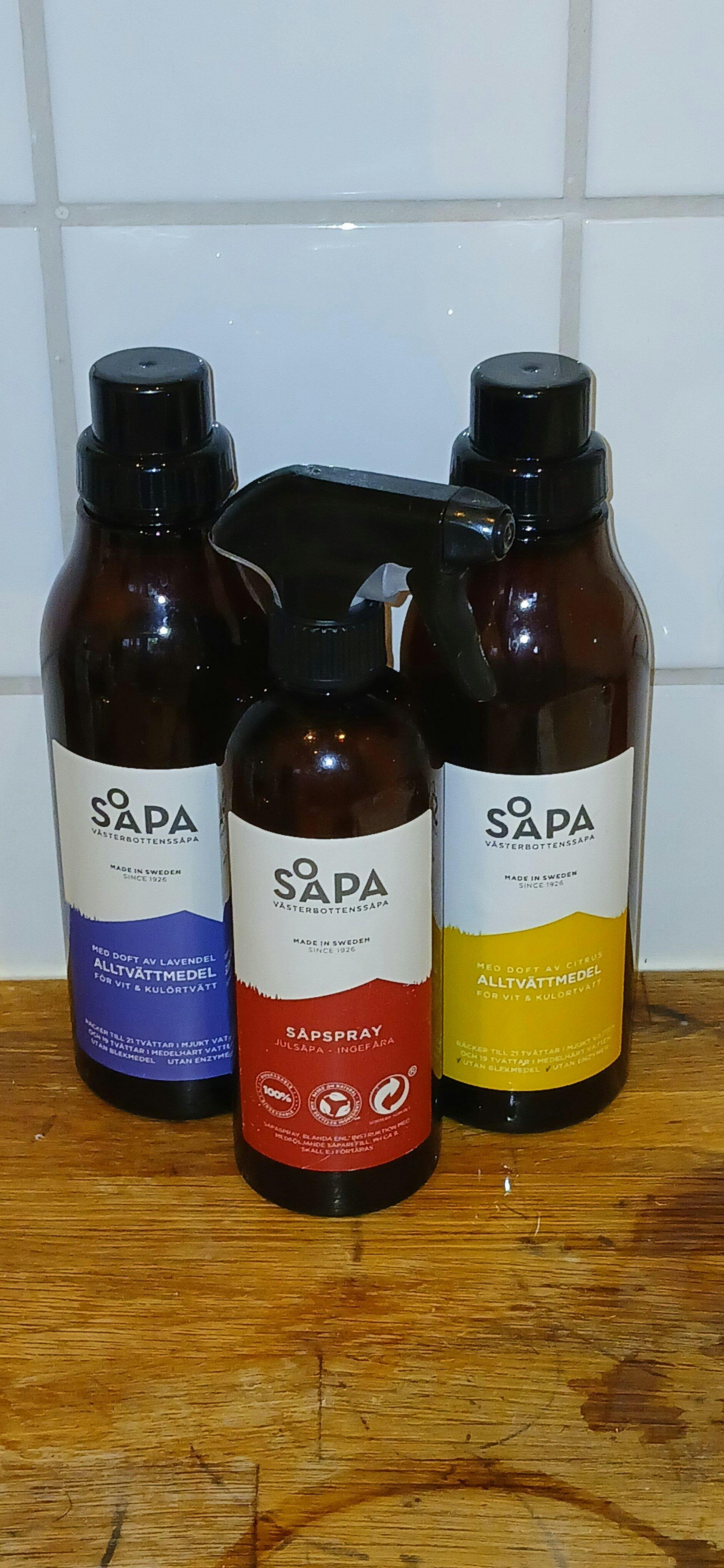 Vi erbjuder vårt tvättmedel med doft av äpple, citrus eller lavendel, samt en oparfymerad variant för den som föredrar helt utan doft.