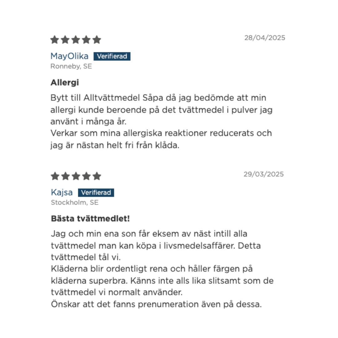 - Innehåll: Nonjoniska tensider>5<15%, tvål<5%, polykarboxylater<5%, parfym.