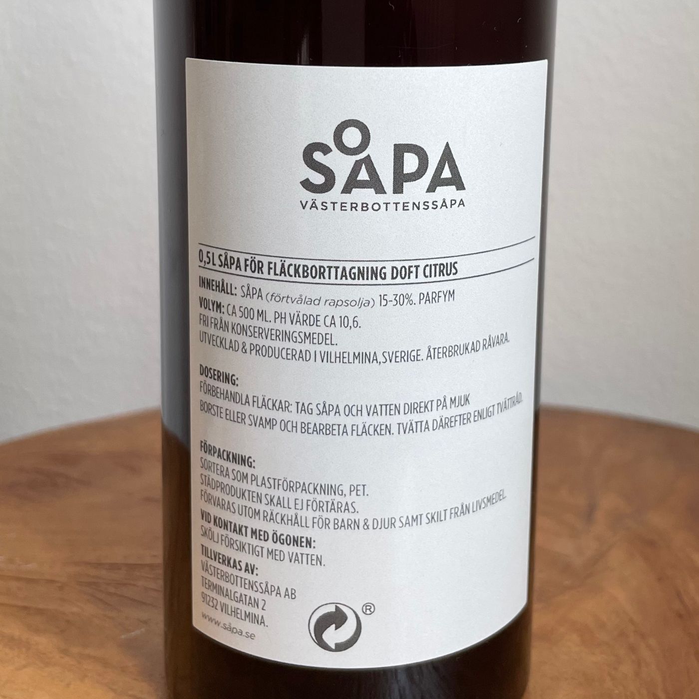 Västerbottenssåpas fläckborttagare är tydligt märkt med fläckbort och har samma gula färg som vårt tvättmedel. Förvara tillsammans med tvättmedel och ta för vana att förbehandla svåra fläckar med vår såpa för fläckborttagning och en mjuk tvättborste.