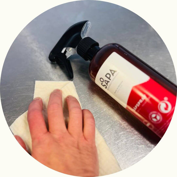 Känsliga ytor som tex fina parkettgolv - spraya på en fuktad microfibermopp och torka golven med endast såpspray och den lätt fuktade moppen.