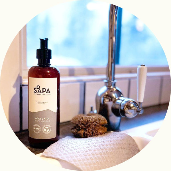 Västerbottenssåpa är en överfettad såpa och är därför extra effektiv mot fet smuts, vilket är den vanligaste typen av smuts i köket.