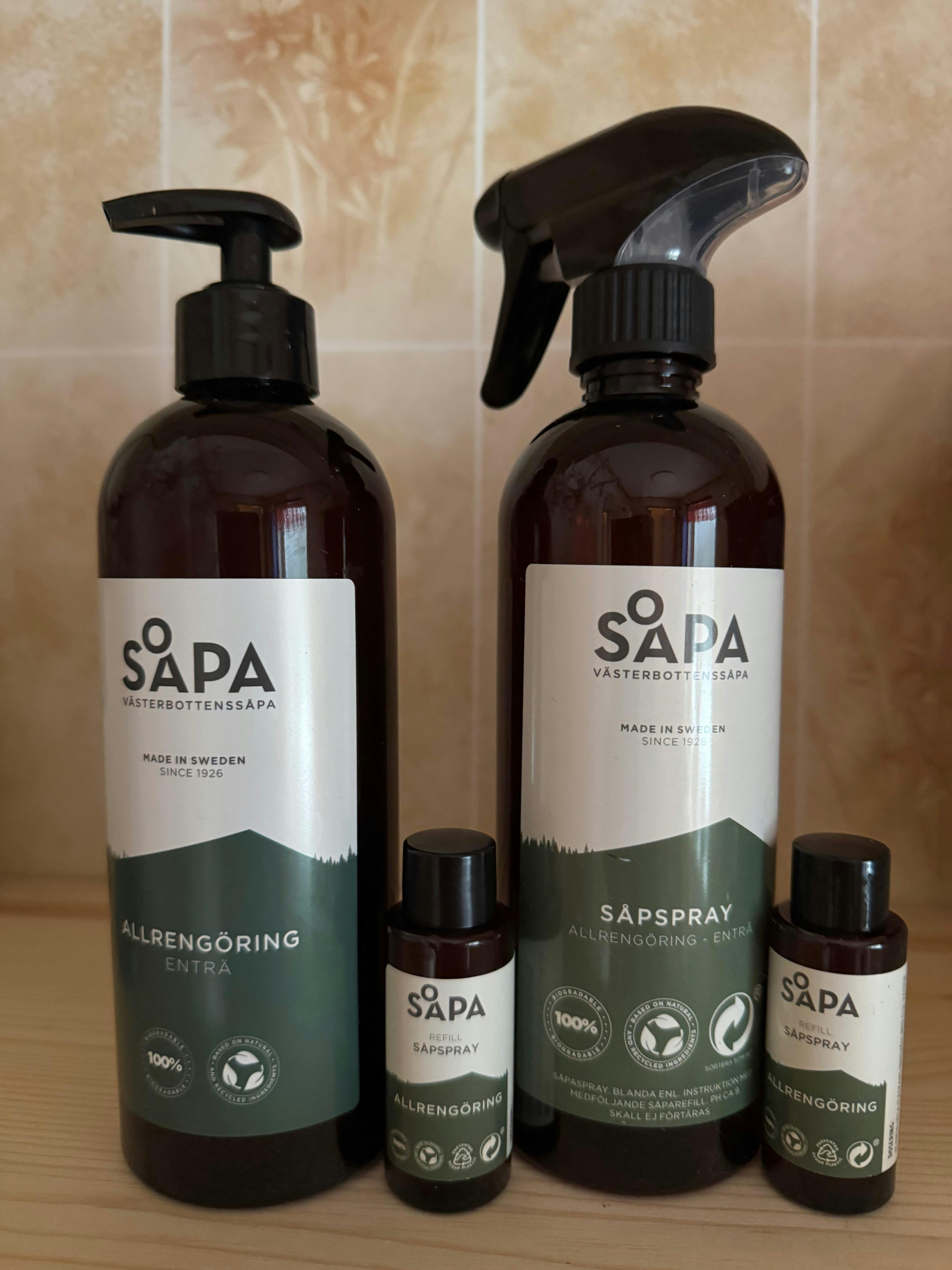 Badrumssåpan har en doft av Västerbottens granar, Allrengöringssåpan har enträdoft och såpsprayen för köket är oparfymerad.