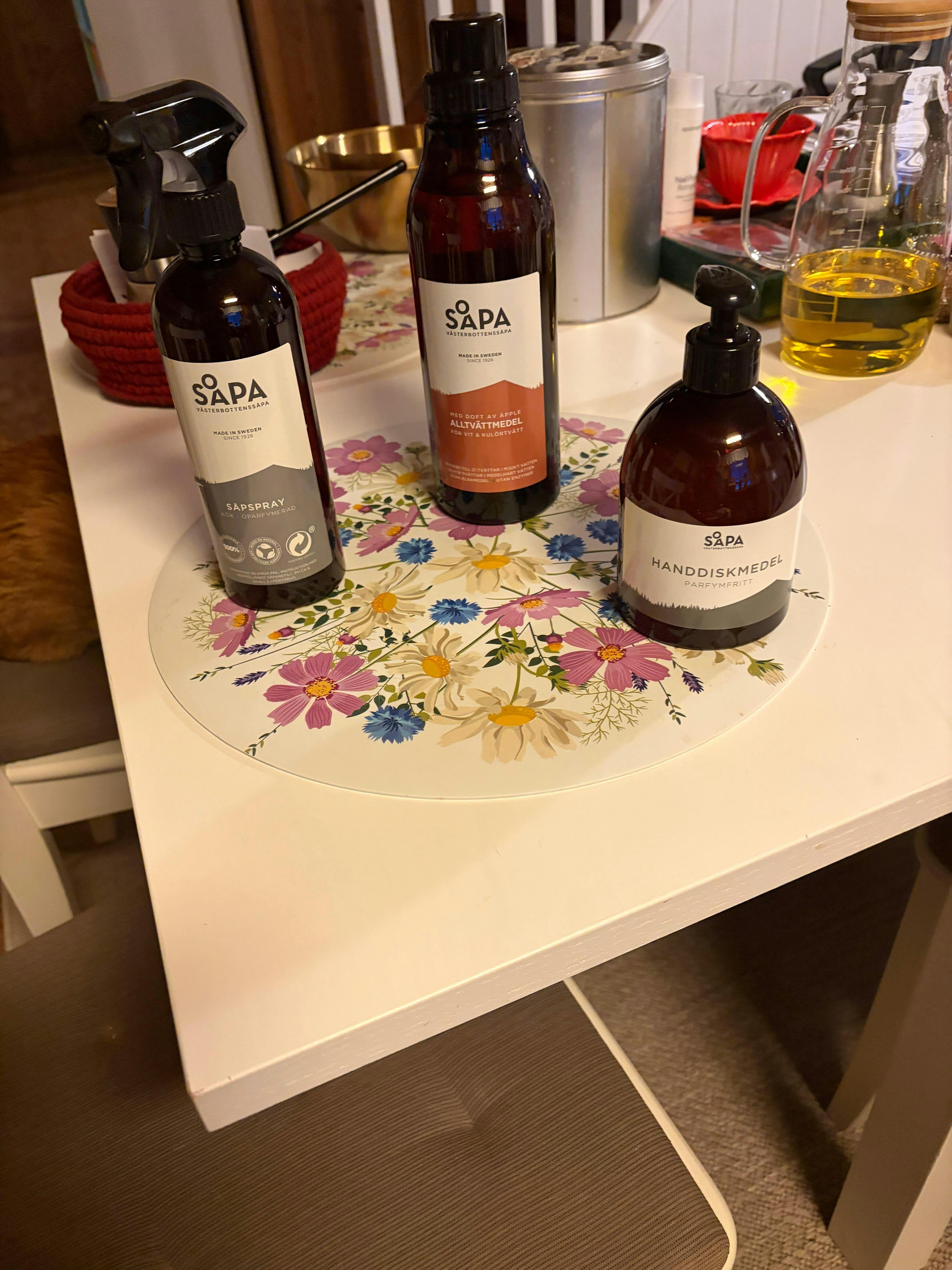 - 3 st återanvändningsbara flaskor för Såpspray 0,5L (allrengöring, kök och badrum)