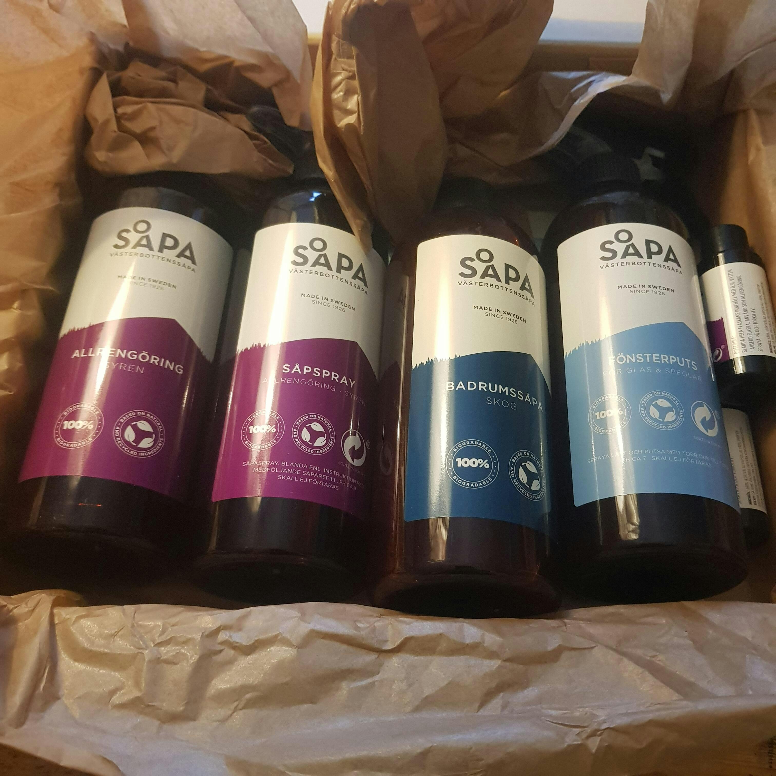 En flaska såpa inklusive produktion, förpackning och transporter har ett CO2 utsläpp på ca 237 g. Det kan jämföras med utsläppen för producera 1 kg palmolja som är ca 10 kg.