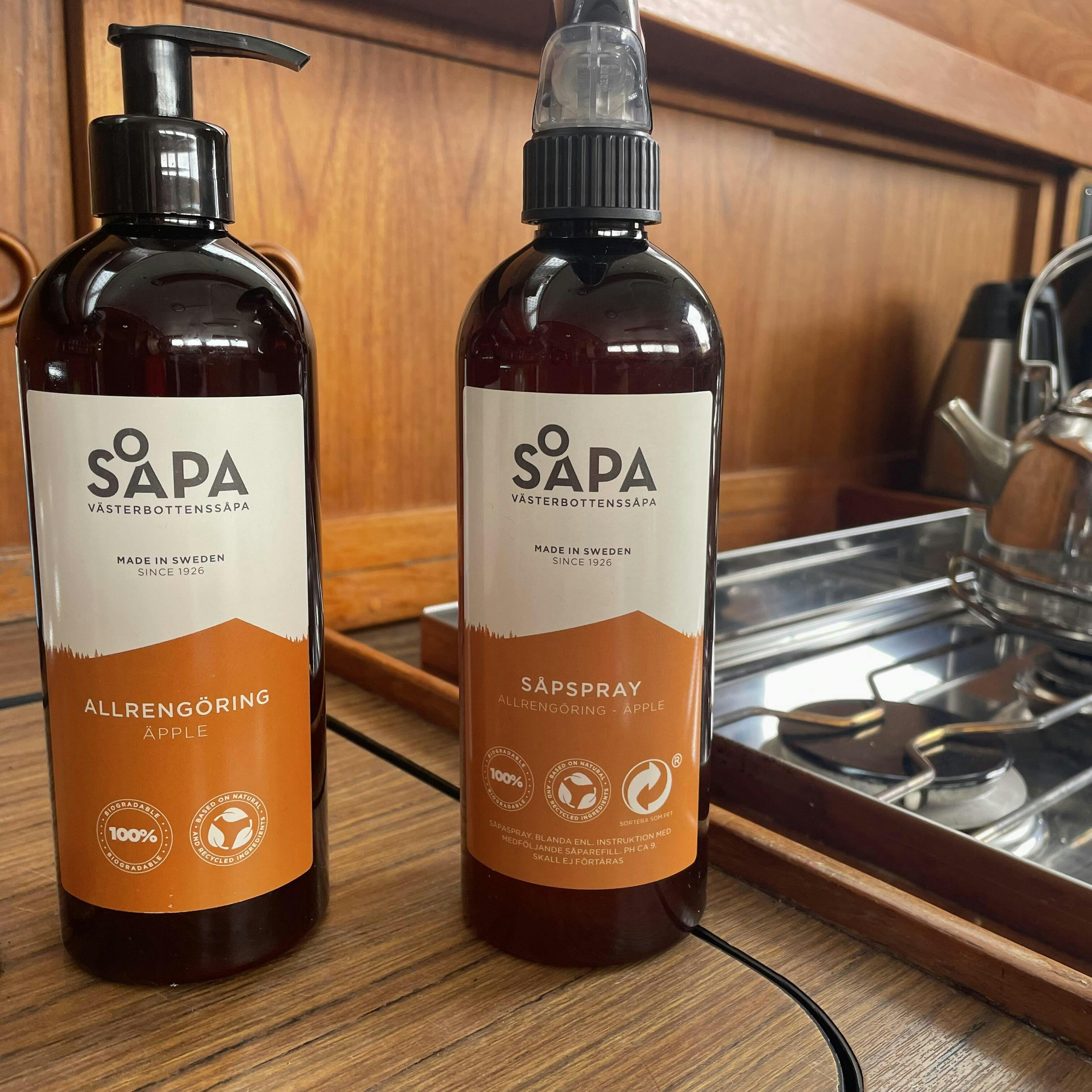 Vår såpa innehåller endast vatten, såpa (förtvålad rapsolja) 15-30% och eventuell parfym.