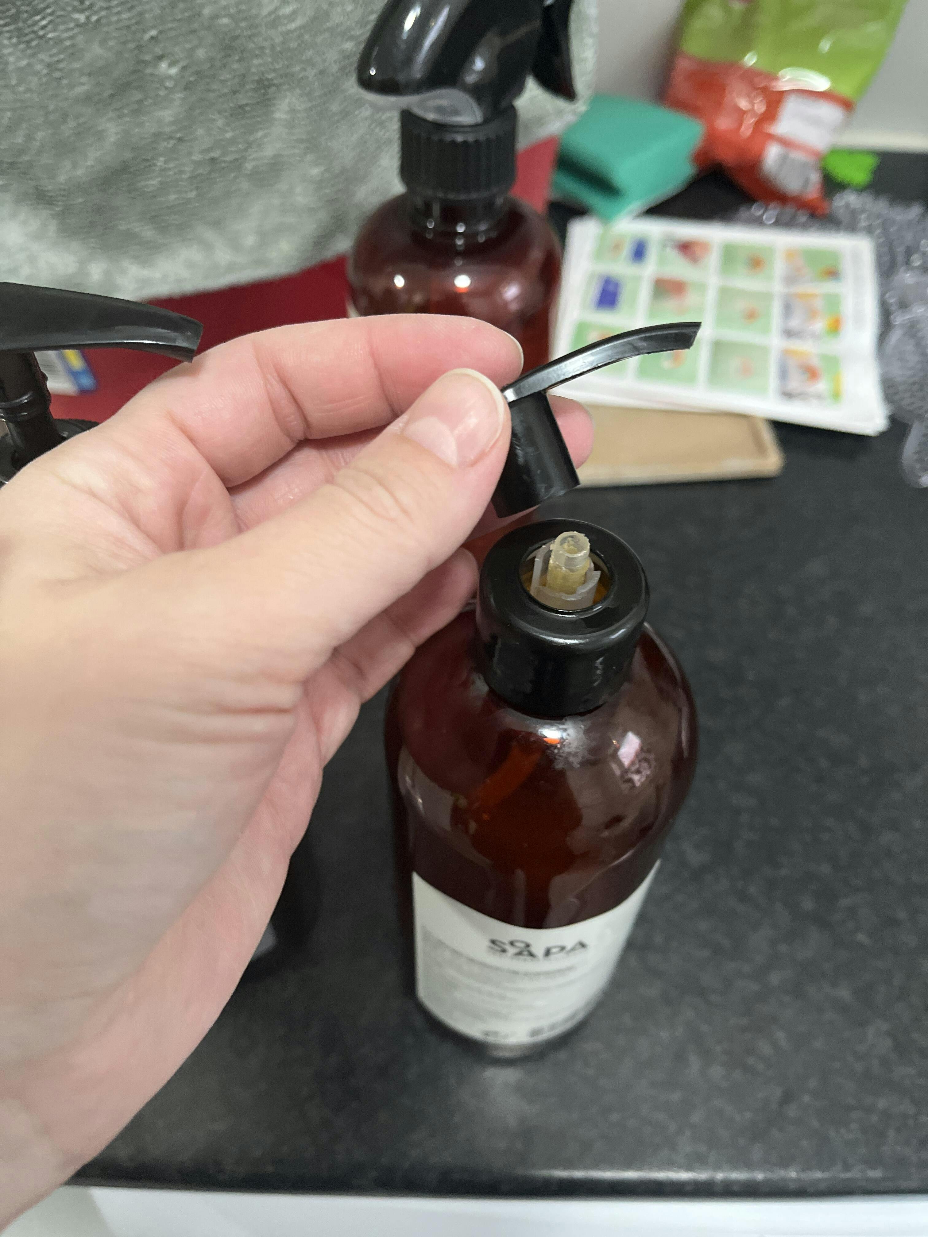 Töm hela refillens innehåll i sprayflaskan och fyll på med ljummet vatten.